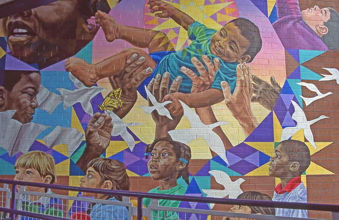 The design for "Children Are Our Future" was selected by competition. It spans three stories of an interior wall in the Youth and Family Services Building of the Dimock Community Health Center.