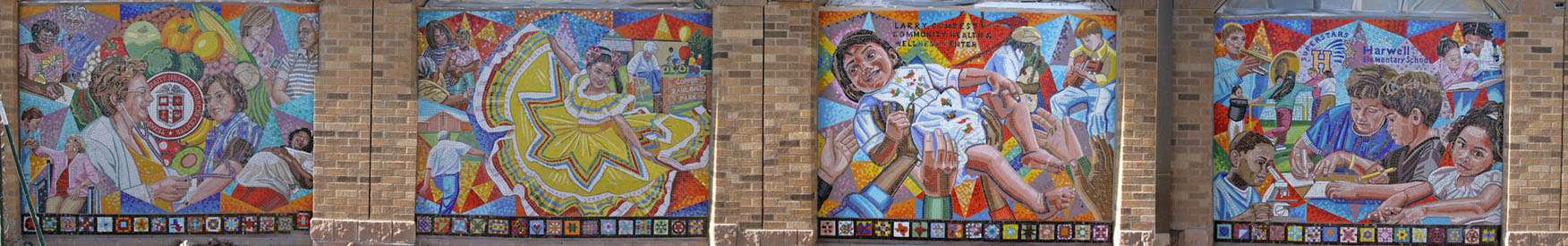Larry Combest Community Health and Wellness Center Mosaics 4 panels, each measure 8ft. X 9ft Lubbock Texas [glass mosaic tile on exterior walls]