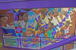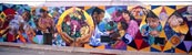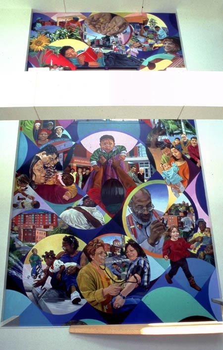 This mural, in the front lobby of a neighborhood health center, depicts images of health care interwoven with images of community history. A central image is of the doctor with the stethescope listening to the heartbeat of the surrounding community. The mural design was the result of a long process of interviews and brainstorming with longtime staff and residents of nearby neighborhoods.