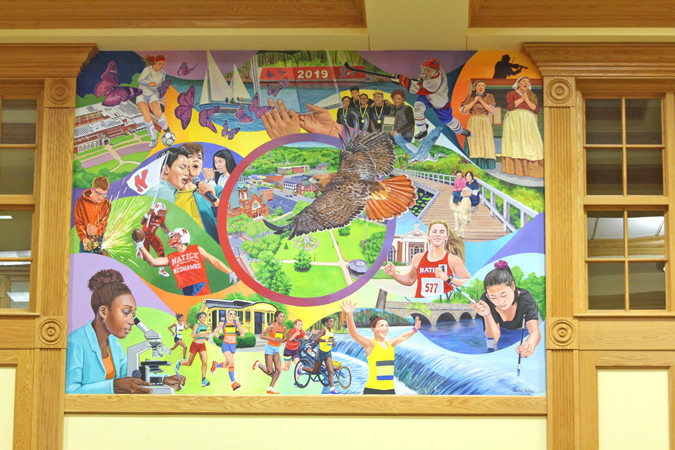 The Natick High School Library Mural was commissioned by the Class of 2019. The images in the mural are based on suggestions and ideas generated by students and staff and gathered by the school for the artist. The ideas were developed with the school and students from the Class of 2019 during the design phase, with representations of the school and the town, including people who have shaped the class of 2019: a student who passed away with a purple butterflies, Redhawks, Caseys diner; sports and clubs (speech, theater); the marathon, special Olympics and relay for life; town library; town common; farmers market; nature preserves. In the middle of the design is an aerial view of the downtown and town common, seen from the perspective of a redtail hawk flying above.