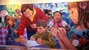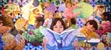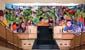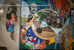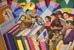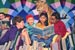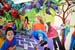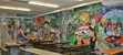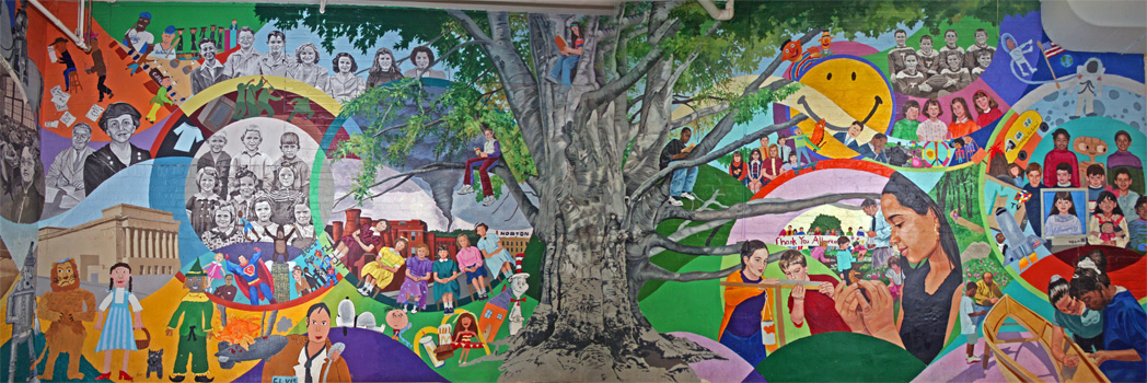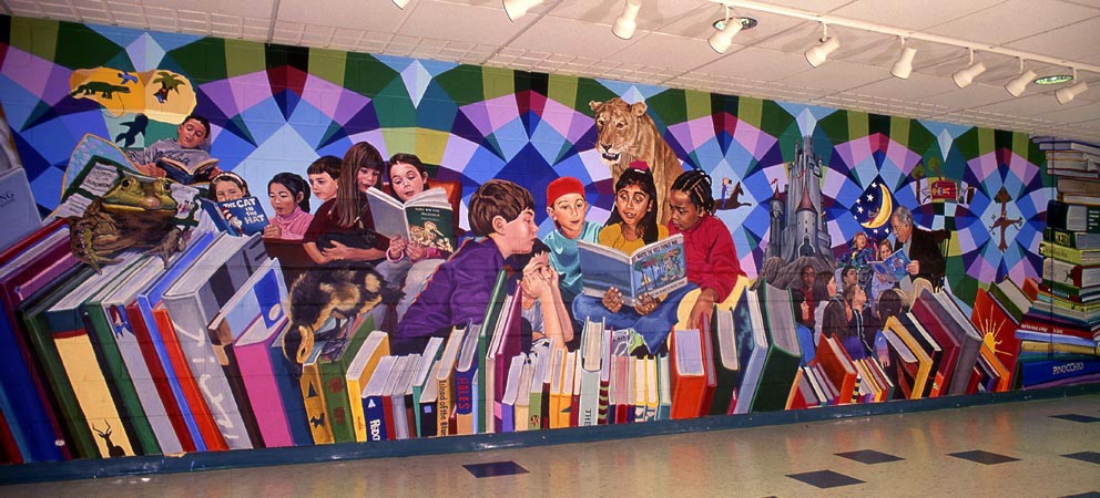 "Joy of Reading" is an interior mural that is located next to the school library. It features students reading in different settings, in a landscape of books.