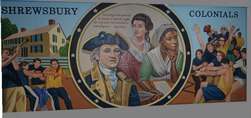 The Shrewsbury High School Colonial Mural was designed and painted collaboratively by David Fichter and Joshua Winer. It was the gift of the Shrewsbury High Class of 2013 as a representation of class spirit and unity. It represents the colonial themes which are the symbol and mascot of the school through portraits of historical figures. General Artemas Ward was from Shrewsbury and was commander of the Massachusetts militia at the Battle of Bunker Hill and was later second in command of the Continental Army. Phillis Wheatley was an African American poet in Boston during the American Revolution. Abigail Adams (wife of John Adams) was an outspoken advocate of women's rights during the colonial times.