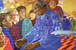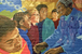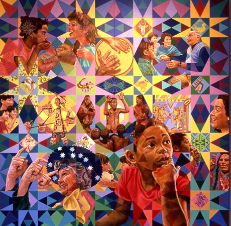 "The Storyteller's Quilt" was selected by competition and funded through the Montgomery County Art in Public Schools program. It depicts Storytellers in various cultural traditions, with a special emphasis on elders passing on their history through stories with youth.