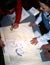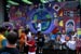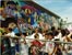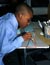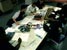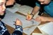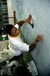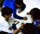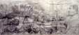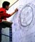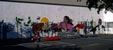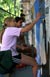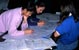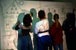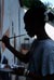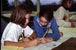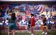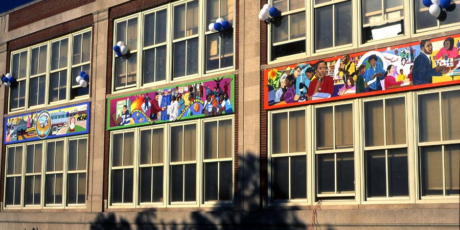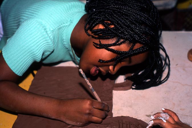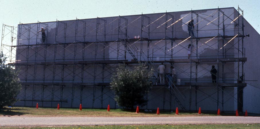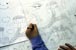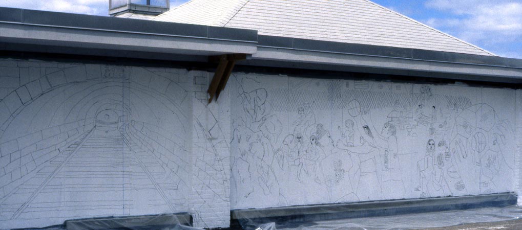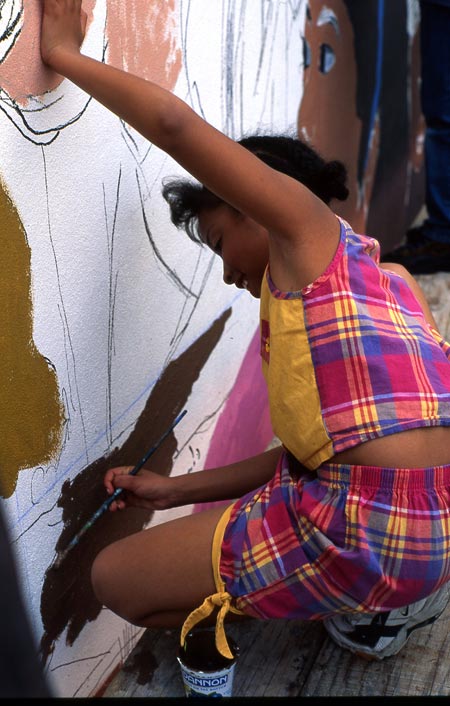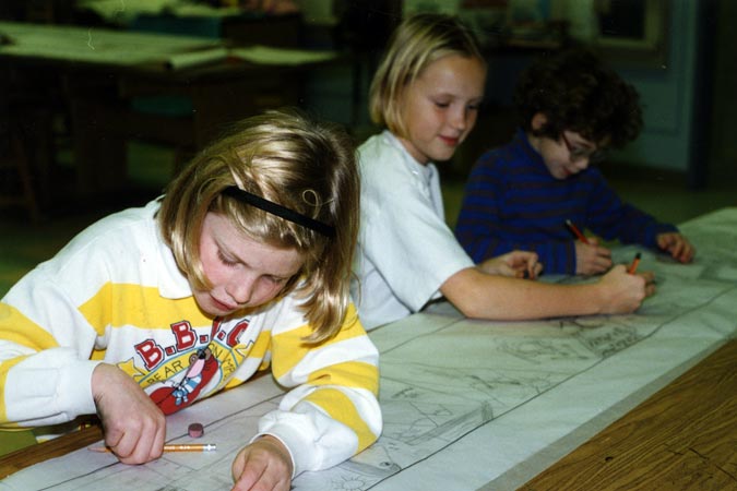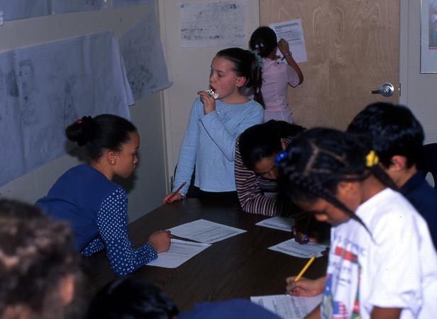 There are usually four design teams with approximately 10 students per team, who brainstorm about a chosen mural theme. After generating ideas and images for the mural, students work in small groups on scale drawings that represent the overall design. Often they incorporate drawings made by other students in the classroom. The design is made on vellum tracing paper to facilitate the easy inclusion of other students' drawings.
