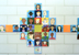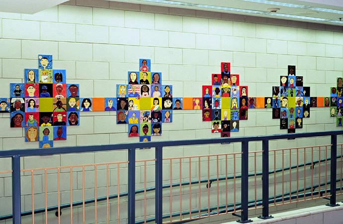 During a 25 day residency, all students (grades K-8) and teachers in this elementary school, designed and glazed ceramic tile self-portraits. The tiles were grouped according to grades and installed in a repeating geometric pattern across a wall of the lobby.