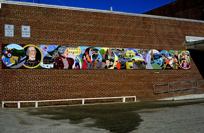 The Canajoharie Middle School mural was created with 8th grade students and the art teacher Michelle Egleston in 2011. The theme is the rich history of this town and includes images of the Beechnut Company, native american leaders, Susan B. Anthony who taught in the town for a while, and others.