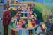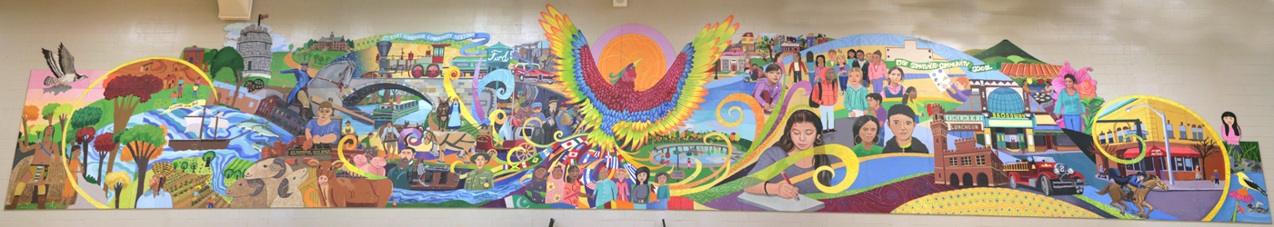 After a devastating fire, the East Somerville Community was rebuilt. The artist worked with students of the school to create a large mural and mosaic for the new building. The mural is about the history of East Somerville and the school. In the middle a colorful phoenix rises, with its tail becoming the flags of all the immigrants that have historically come to live in East Somerville. Paul Revere rides through the mural as he rode through East Somerville in 1775 (up Broadway). The mural is located in the new gym.