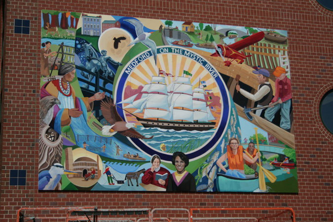 The Andrews Middle School is located on a former site of 19th century Medford shipbuilders, on the banks of the Mystic River. Students made drawings with the art teacher based on Mystic River themes tracing history, flora and fauna. At the center of the mural and the town's history there is a clipper ship under full sail. Other images include Squaw Sachem (Queen of the Mistick), Paul Revere, the Middlesex Canal, shipbuilders working on a clipper ship, the herring/alewife yearly run, and many other images about Medford on the Mystic.