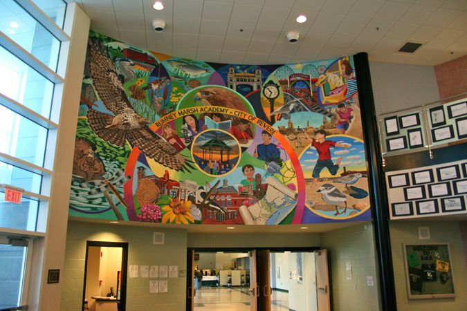 The Rumney Marsh Mural Project was initially conceived by a group of middle school students who petitioned the art teacher and principal to create a mural for the lobby of the new school building. The mural wall is 13 ft. high and 22 ft. wide on a prominent curved wall. Mural artist David Fichter in collaboration with art teacher Rebecca Fellows worked with art students from grades 6-8 to conceptualize, draw, and paint a large scale permanent mural based primarily on the natural history of Rumney Marsh, namesake of the school and historical name for Revere and environs. Students, teachers, and artists developed the theme of the mural during brainstorming sessions at the beginning of the residency. The theme focused on the rich natural history of the local wildlife and habitats, as well as the history of Revere as an immigrant working class community, with the famous Revere Beach amusement parks.