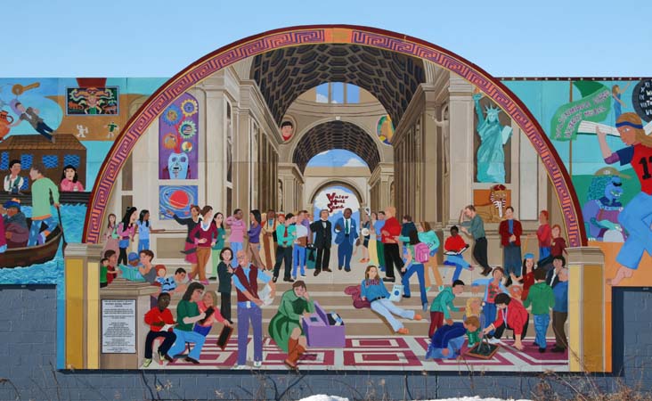 The Bruce School Family Mural was designed and painted by students from grades 5 through 8. The mural highlights students and learning as well as the immigrant cultures of the City of Lawrence.