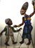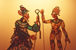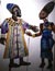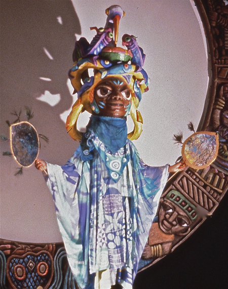 "Creation of the World" was a shadow puppet extravaganza based on Yoruba creation stories and set to music by Darius Milhaud, which premiered at Lincoln Center. Subsequent performances were with the Boston and Chicago Symphony orchestras. The set consisted of two large shadow puppet screens with carved foam borders designed to look like a giant "divination tray", an object central to the Yoruba religion. The center of the tray was a shadow screen upon which the characters told the story. The character of Oshun which is the river orisha, or goddess, is played by a dancer with a larger mask, designed with fish and water birds. The second screen was based on a large scale fan also associated with the river goddess.