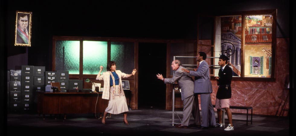 "Accidental Death of An Anarchist" is a zany, madcap political farce by Italian playwright Dario Fo. The set, which represents different floors of a police station uses filing cabinets as an arena for some the antics. When the set transfers to another floor of the police station, the window backdrop simply rolls up so as to give the illusion of another floor without changing the room layout.