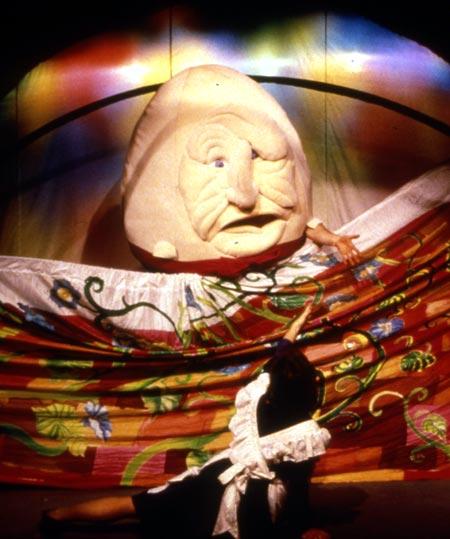 The set was created from painted silk drops hung on arched poles. The silks were moved by the actors in view of the audience. As one silk piece was pulled off, the next piece was pulled from the other side. Puppets included a three headed blue caterpillar with many hands provided by child actors and huge humpty dumpty with moveable face parts. The cheshire cat was a mirrored lexan reflective puppet who smile broadened as the mirror was bent. Winner of 1999 IRNE for Best Set Design (with Will Cabell).