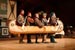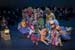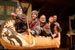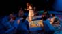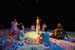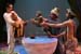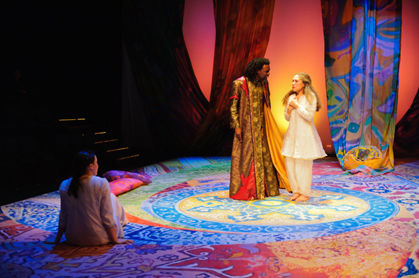 The set design for this co-production of the Nora Theater and the Underground Railway Theater is a large painted floor with patterns and silk drops hung over an upstage cyc. Puppets (hand, rod, and reflective) were primarily for the Sinbad story and inlcuded a large mythic bird called a Rukh, which transformed from a Persian tent. The Rukh egg was made from the round cushions that were part of the set decor. Winner of IRNE Award (2012) for Best Puppetry (with Will Cabell)