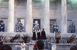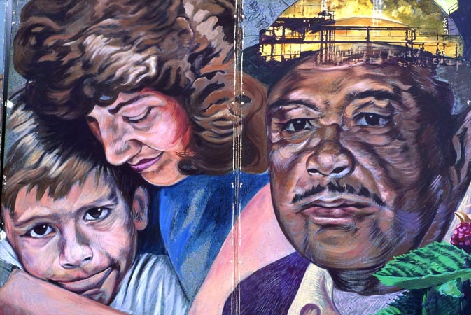 Set in the round was surrounded by wall murals.   Central Square Theater, Cambridge, MA    [Acrylic paint on aluminum panels.]