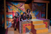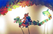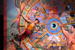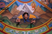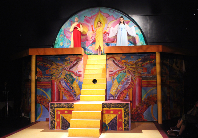 "Journey To The West" was adapted by Mary Zimmerman from an ancient Chinese story about a monk who travels China to India in search of Buddhist spiritual scriptures and enlightenment. Much like in Wizard of Oz, he is accompanied by three eccentric characters who assist him in the quest. The Central Square production was directed by Lee Mikeska Gardner. The set was a long alley arrangement with audience on either side of a long painted floor that unrolls like an ancient scroll from a Buddhist wall mandala at one end to an abstracted temple at the other. The mandala mural is also a climbing wall. The temple is covered with painted silk murals. Liane Noddin was my painting assistant along with many volunteers.