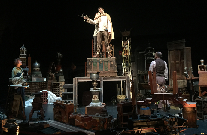 The Happy Prince and Matchless are two beautiful stories from different times, with the shared mission of revealing the value of the thing thrown away, overlooked – the proverbial “stone that the builder refused”. Frederick, the boy at the center of “Matchless” is a passionate collector of junk, which he salvages and artfully assembles into a magical town in the attic, out of sight of his family. As Gregory Maguire describes it, “the houses were made of empty boxes that he’d lifted from merchants rubbish bins”. Or “ a gold-plated chocolate gift box sporting a porcelain dome”. This idea became the guiding principal for me and my artistic collaborators Will Cabell and Penny Benson, in our rendition of the set and puppet characters in both Matchless and the Happy Prince.