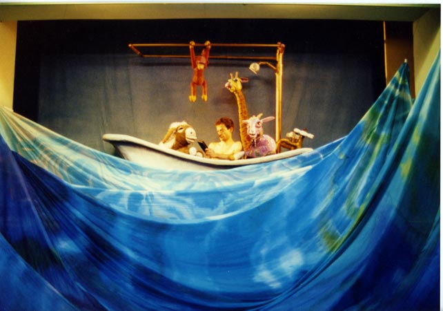 "Noah's Bath" was written and directed by Eric Bass for a production at the Theatre des Marionettes de Geneve. The story revolved around a rather pompous Swiss Judge who has been given the task of bathing his son Noah while his wife takes a break and goes out. Noah who is a playful child decides to stop up the bath which then overflows flooding the room, with the bath tub now floating on the flooded water. The father ends up in the bath while the child's toy animals (puppets and marionettes) become the "animals" in the ark.