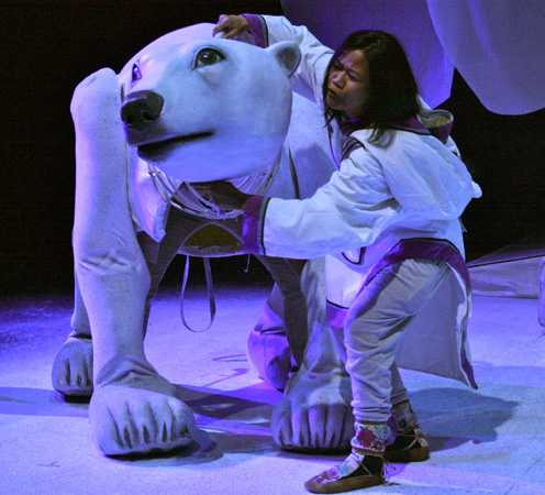 Puppet Design for Sila, includes two life size polar bear (mother and daughter). Mother bear is operated by 3 puppeteers and the baby bear is operated by a single operator. There are a number of scenes created with shadow puppets (reflective and shadow) mostly involving Inuit stories, such as an encounter with Nuliajuk the goddess of the oceans. Will Cabel constructed the bears and Yetti Frenkel sculpted the heads from the designs.