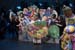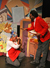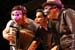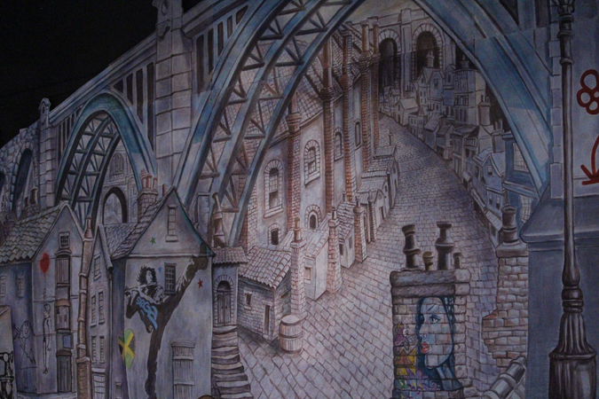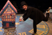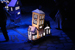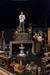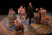 A Christmas Carol is a ghost story. My designs conjure the ghost cityscape of 19th century London tattooed with contemporary street art and graffiti that reflect the energy and spirit of the many commonwealth cultures inhabiting the city today. It was a breakthrough when I realized that the biting political stencils of Banksy inhabit a Dickensian world of Victorian street urchins. The street murals surround the audience seated in the round as ghost backdrops, while the actual stage is painted with a giant clock and cobblestone streets. Against this backdrop there are miniature buildings with interior lighting like lanterns. The miniatures are mounted on rolling wagons, sleds, baby carriages, and wheelbarrows to set the stage for different scenes. They evoke the tiny glass buildings that often decorate the bases of family Christmas trees. A team of artists collaborated on the design, building and painting of the sets and puppets, including: Steve Lewontin, Liane Noddin, Sarah Nolan, Charlotte Dore, and Joseph Fichter.