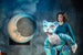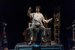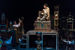 Set was a raised thrust platform painted with patterns representing the Copernican solar system, as well as a simple scaffolding with catwalk walkover. The surrounding walls of the theater are painted with enormous murals representing the solar system, with views of Jupiter and the moon. Space debris from different civilizations and time periods floats by the planets and references specific locations and themes in the play.